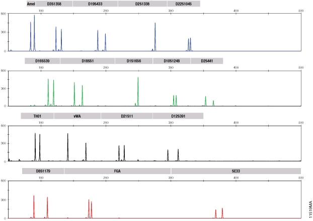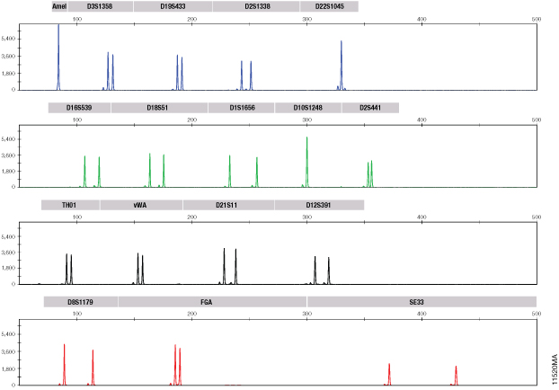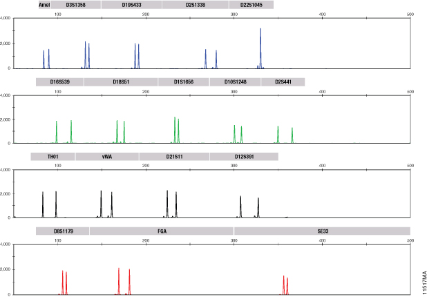 2800M Control DNA (0.5ng) was amplified with the PowerPlex® ESI 17 Fast System for 30 cycles. Amplification products were separated using an Applied Biosystems® 3130 Genetic Analyzer (3kV, 5-second injection).