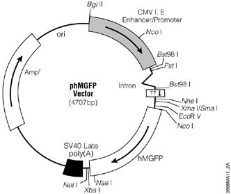 The phMGFP Vector contains the open reading frame for the Monster Green® Fluorescent Protein cloned into a mammalian expression vector. The Monster Green® Fluorescent Protein is encoded by an improved synthetic version of the green fluorescent protein gene originally cloned from Montastrea cavernosa (Great Star Coral). The synthetic gene (hMGFP) expresses a 26kDa protein that shows improved fluorescence intensity compared to the native gene. Furthermore, the hMGFP gene has been codon optimized and cleared of most consensus sequence transcription factor binding sites to ensure reliability and high levels of expression.