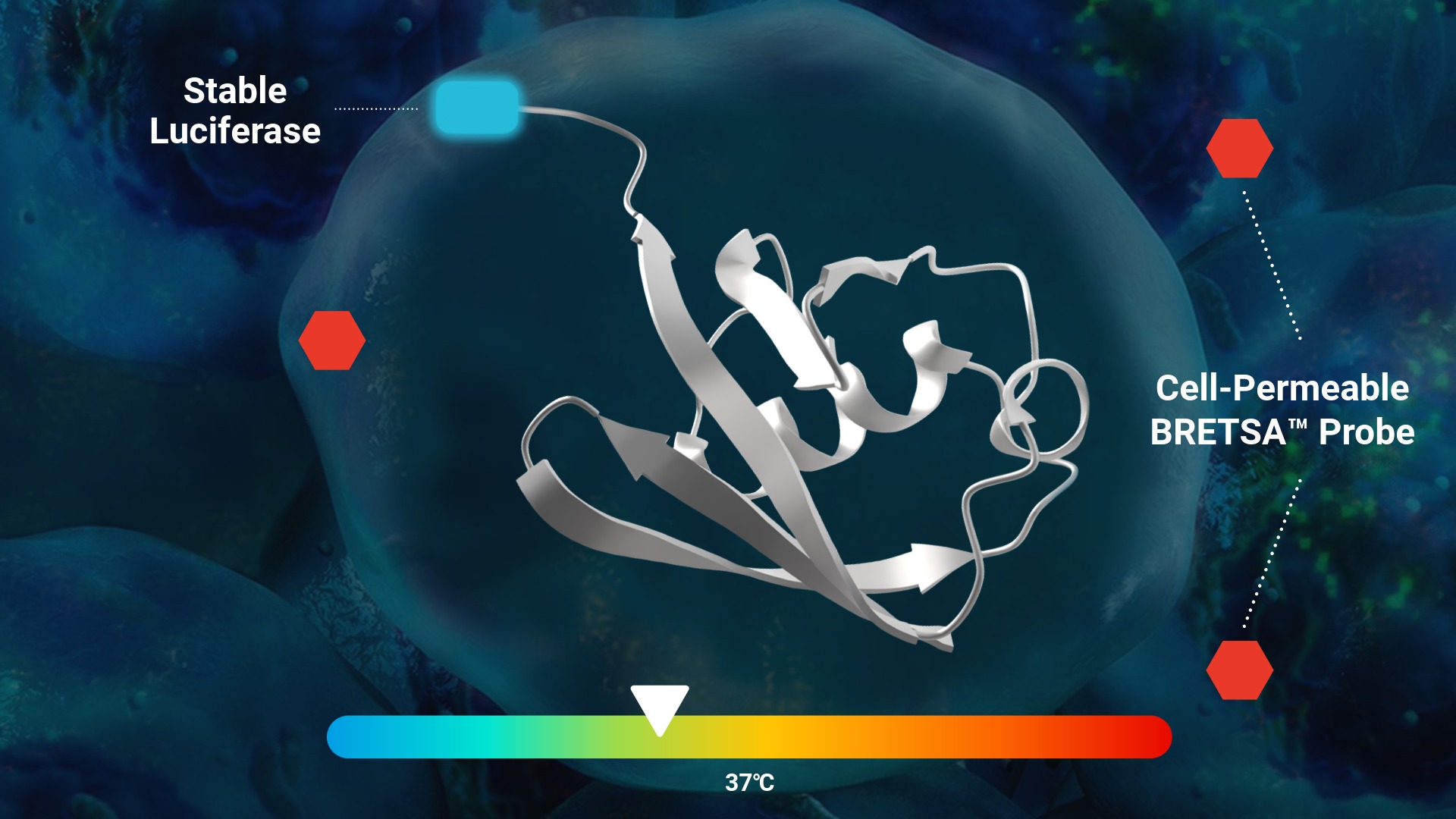 1. Start with a luciferase-tagged target expressed in cells. At low temperature, the luciferase-fused target protein is folded. The cell-permeable BRETSA™ probe shows minimal interaction with the folded protein.